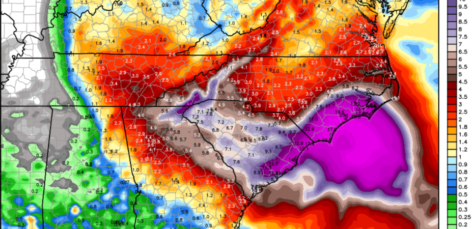 Both North and South Carolina may well break the all-time records for rainfall from a tropical system–here’s the Euro rainfall projection with 10-20 to even 30 inches of rain potentially.