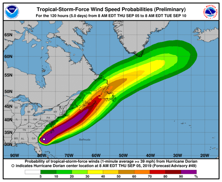 Dorian continues to gain forward speed as it gets caught up in the jet stream and pushed by the trough that is responsible for our cooler push of fall-like weather. The biggest impacts from this storm in relation to the US will likely take place in the next 48 hours in coastal South and North Carolina. Here’s the track as of 11am Thursday morning: