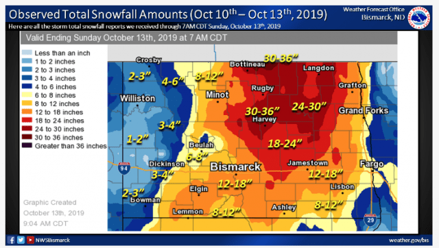 Last week’s incredible snowstorm across the northern Plains caused all sorts of problems for the Dakotas and southern Canada. The leaves were just beginning to fall and the majority of trees still had thick foliage. 2-3 feet of snow fell in spots and combined with winds up to 60mph, a large portion of North Dakota was shut down with impassible roads and widespread power outages. Here were some of the reported snow totals: