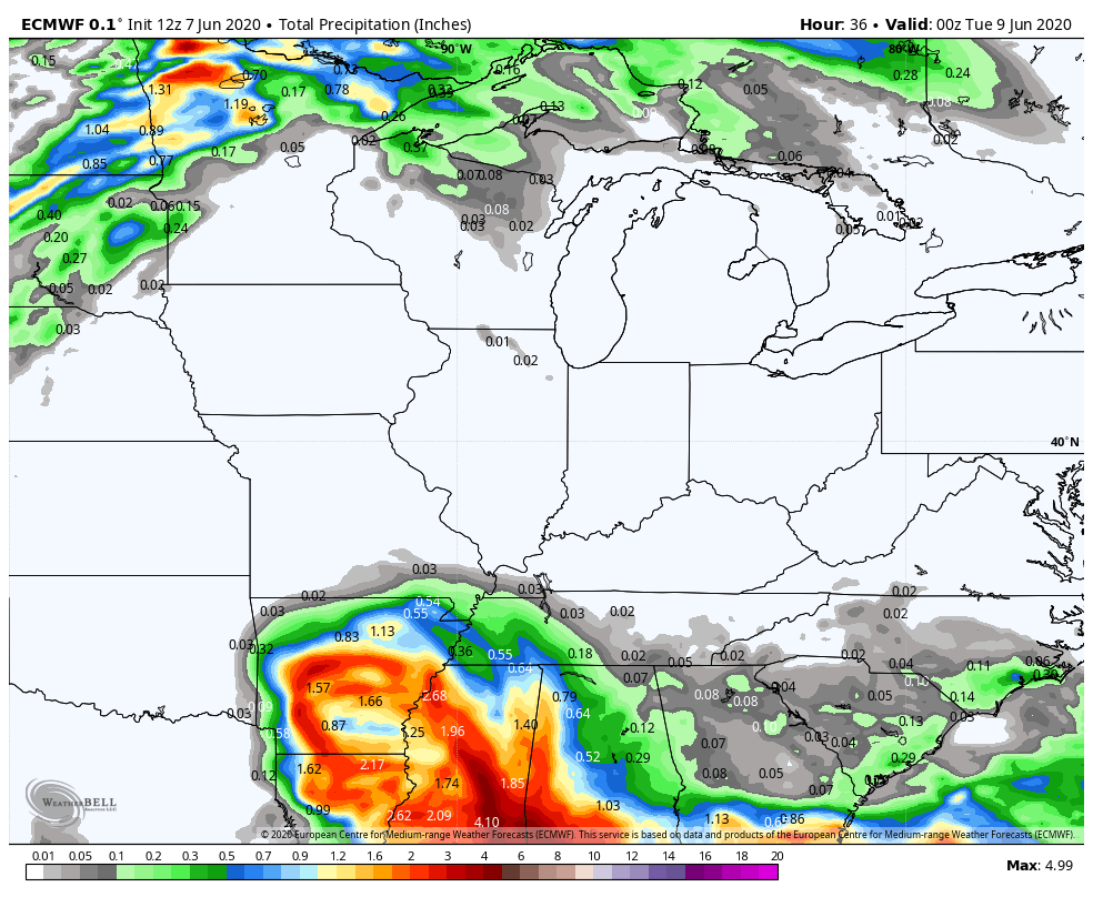 We’ll get some rainfall, but we’re not anticipating a huge rain event. Cristobal will attach to a cold front that’s sitting to our west right now and we’ll likely see a round of rain with the actual remnants and then another wave with the cold front before we bring in more refreshing air for next weekend. Rainfall totals will be impressive where the center of circulation travels–but this will be a fairly quick mover, so flood threats look minimal: