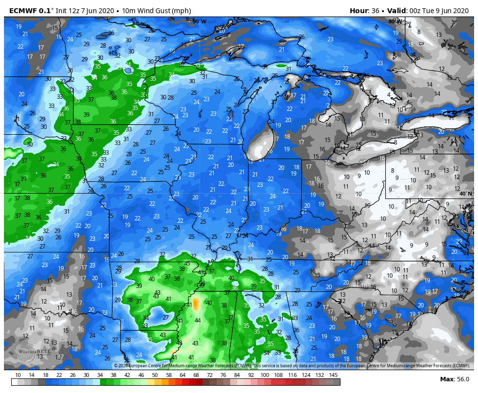 We’ll likely see some decent wind gusts as the remnants breeze through–it all depends on the exact track of that low, but our strongest winds would be Tuesday into Wednesday as the heart of the system heads north through Illinois. Winds could gust over 40mph if the low passes close enough: