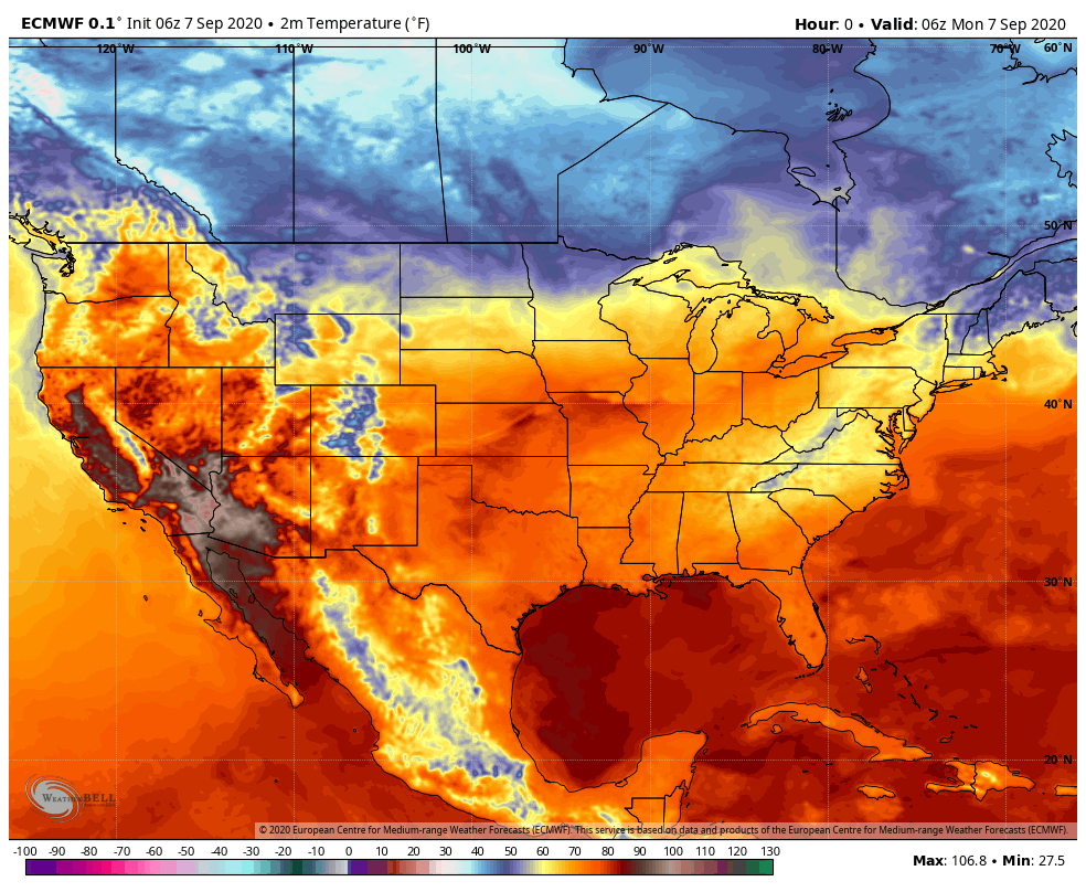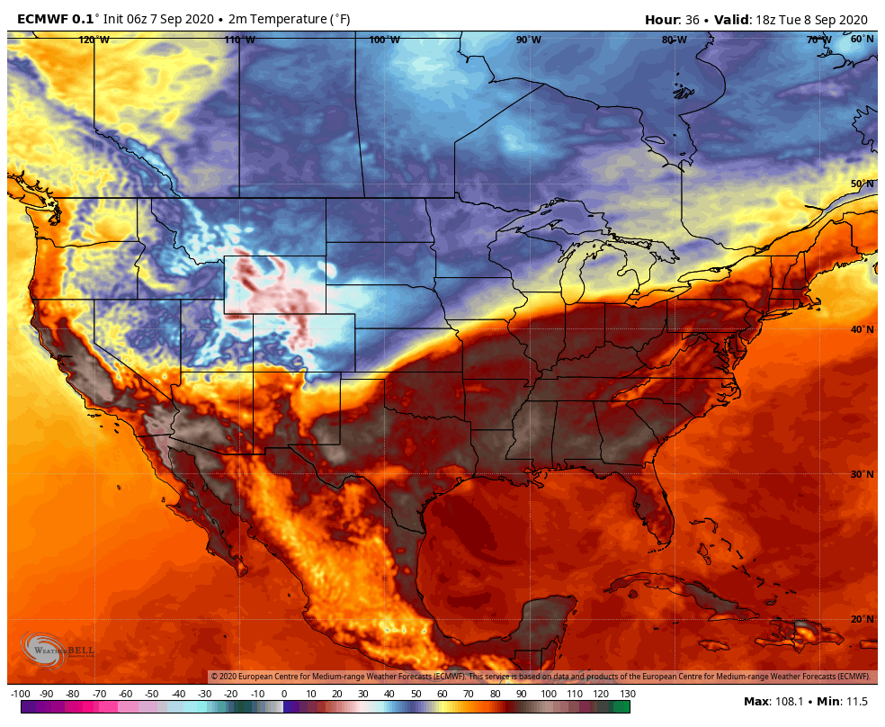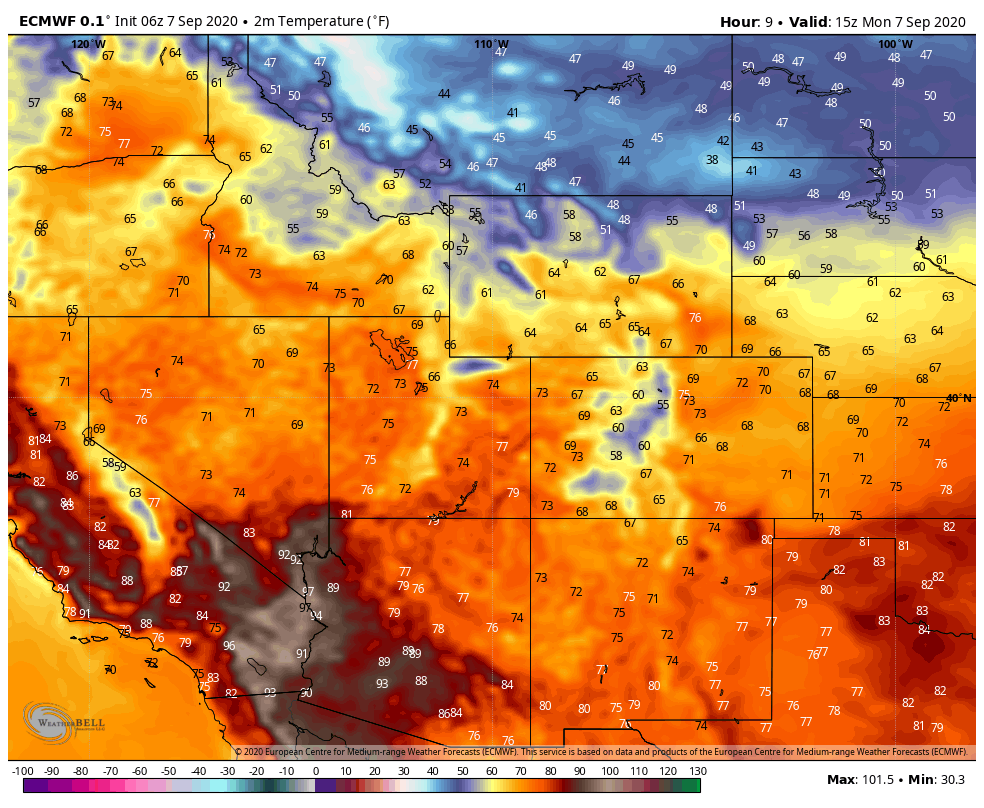 A strong, late summer storm system is descending on the inter-mountain West from Canada and will bring some wild weather changes in the next 24 hours. Denver, for example, has been in the upper 90s to near 100 the last two days. They’ll likely hit the upper 90s again today before temps crash. In 12 hours, the temps will drop all the way into the 30s and snow will begin to fly. And then accumulate! Look at the unseasonably cold air moving south into the western US: