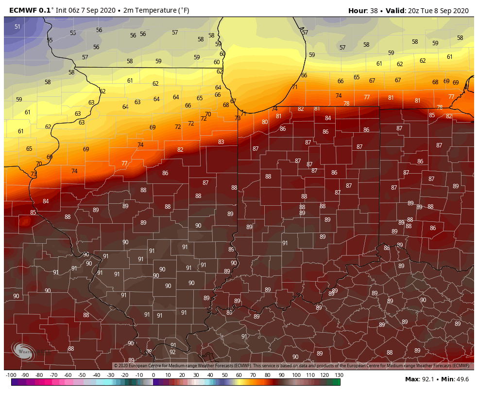 This will set up quite the temp contrast over our area Tuesday and Wednesday. We’ll be divided by a front and on the northern side, temps will hold in the 60s. (with 40s for highs in Wisconsin!). South of the front, temps will reach well into the 80s with humidity: