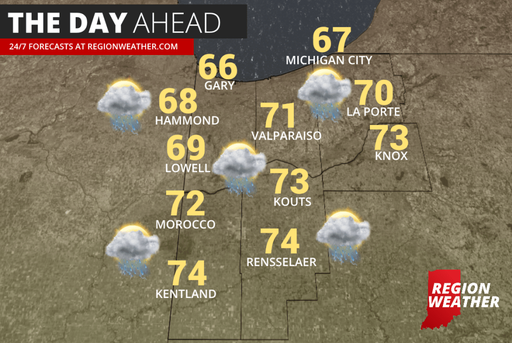 A frontal boundary will continue to push north through the Region bringing a few additional rounds of rain like we’ve seen this morning. That temp contrast we highlighted a few days ago will develop today with 70s south and a cool day in the 60s to the north!