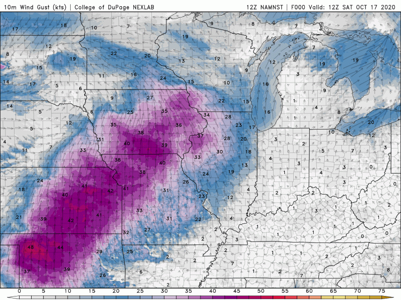 Of biggest concern is the strong wind that will develop Saturday. Winds will become quite gusty by early afternoon on the order of 35-40 mph at times. We’ll also have low relative humidity in place so we’ll see dangerous fire conditions. What does that mean? It’s not a good day to get the burn barrel out, bonfires, etc. You get the idea–but fires can spread very rapidly on days like this so take it seriously! Take a look at the expected wind gusts and how they move through Saturday into Sunday: