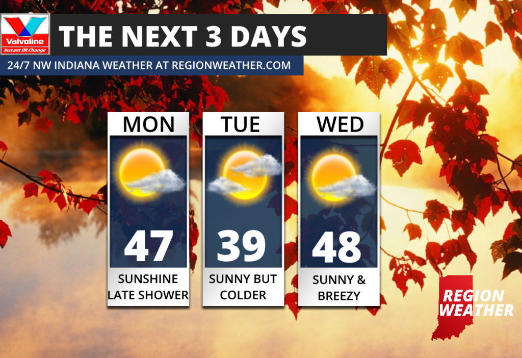 A cold front will drop south through the Great Lakes tonight into early Tuesday bringing a renewed shot at cold air. It will also help to kick off the lake effect snow machine, but not for us here in NW Indiana. We could squeeze out a brief shower later this evening, otherwise we’ll just notice a wind shift and colder conditions on our Tuesday.