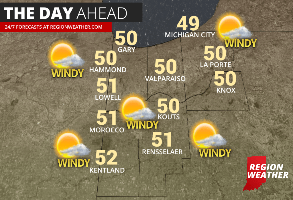 While we’ll see sunshine, our gusty winds will make it feel a tad cooler with gusts over 40 mph possible later today into mainly early tomorrow.