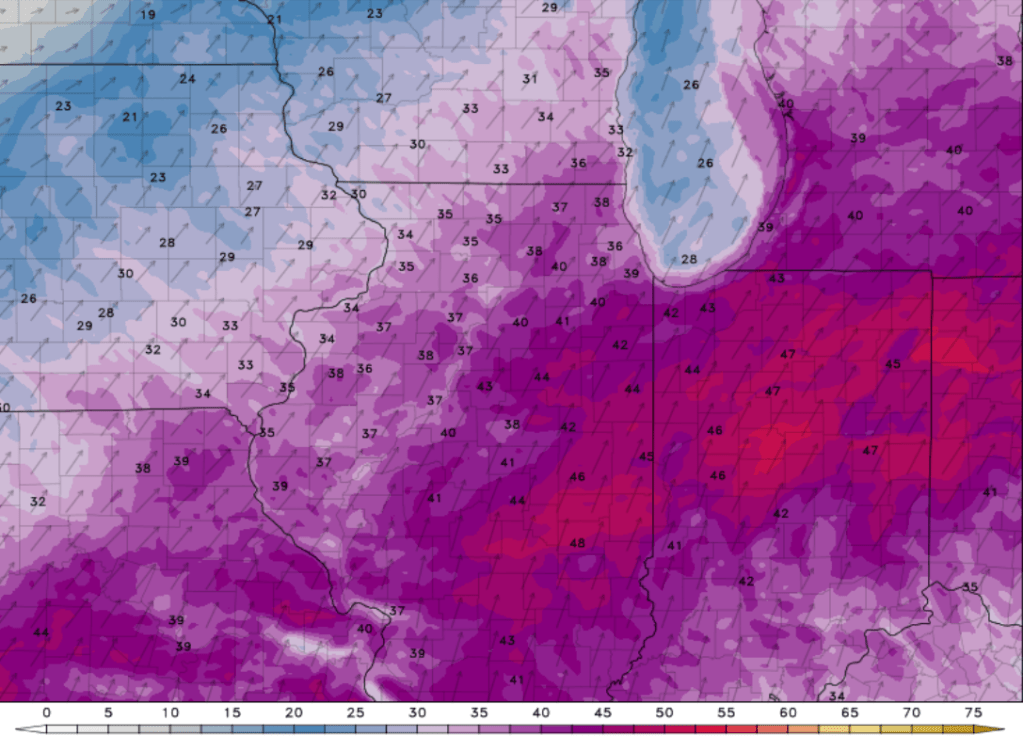 The good news with this wind is that it’s bringing in WARM air from the southwestern US and our high temps will exceed 60 degrees this afternoon! Here’s a look at our forecasted peak wind gusts this afternoon: