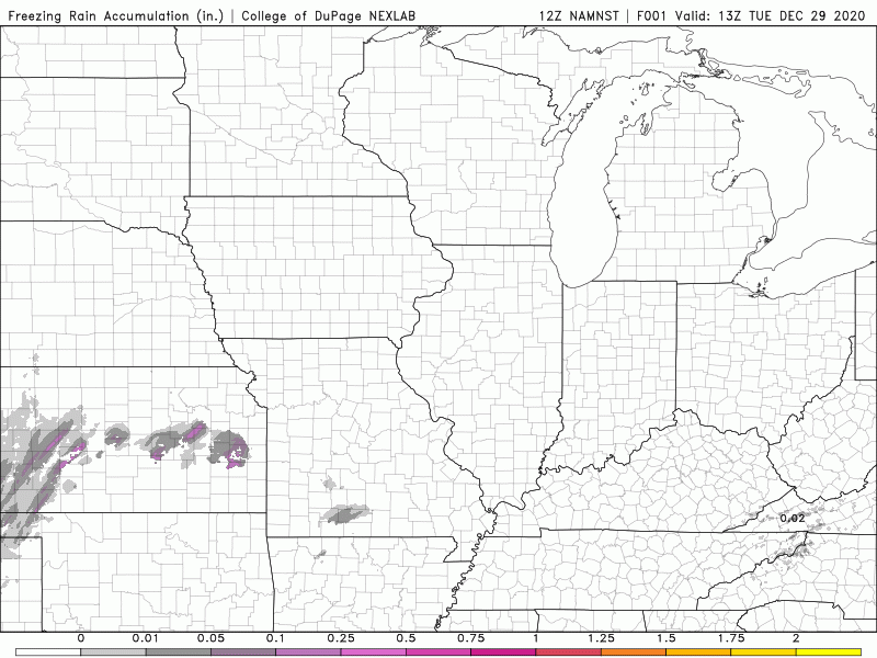 Here’s a look at the potential ice accumulation with this storm–the biggest impacts will be in northern Illinois with some minor icing in the Region. Again, we’re expecting this to occur during the very early morning hours Wednesday before everything melts.