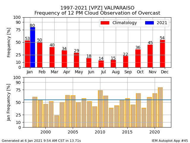 It’s been cloudy at noon 80% of the time so far this year…well above our average of 53% for January. As it stands this is the cloudiest January (at noon) on record, but we still have a long way to go this month and we don’t expect that to hold.