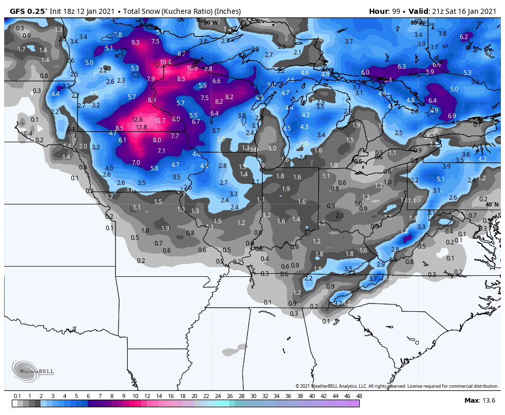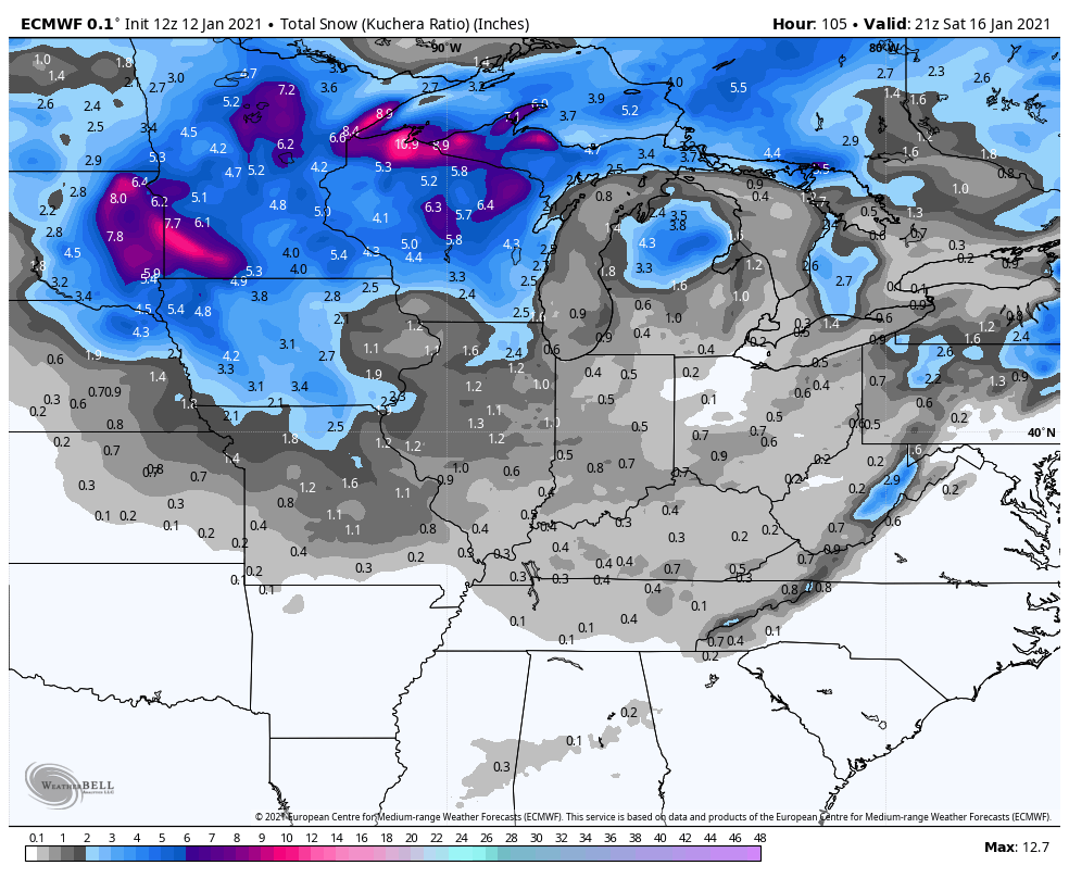 In terms of snowfall, we’re expecting some light accumulations, but nothing particularly noteworthy. As we mentioned a few days ago, we’ll have to watch some of the lake effect with the series of systems moving through over the weekend, but the system itself won’t produce any big snows as it’ll lack that connection with the Gulf of Mexico.