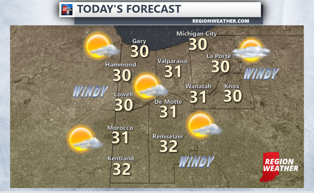 Temps in the mid 10s this morning will quickly recover to near 30 this afternoon on our gusty southwest wind (warming wind). Sunshine will prevail today before clouds begin to increase tonight as that reinforcing shot of colder air begins to work into the Great Lakes.