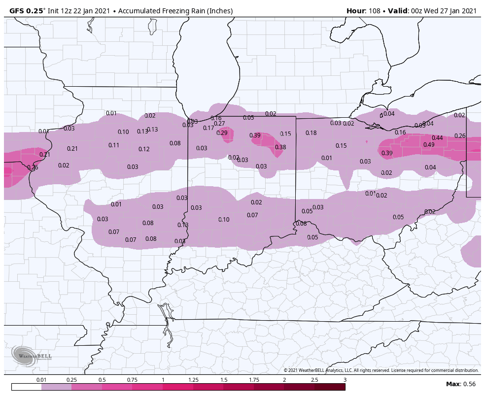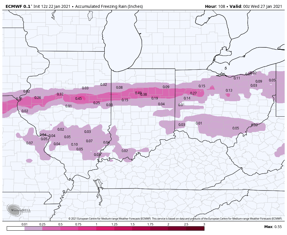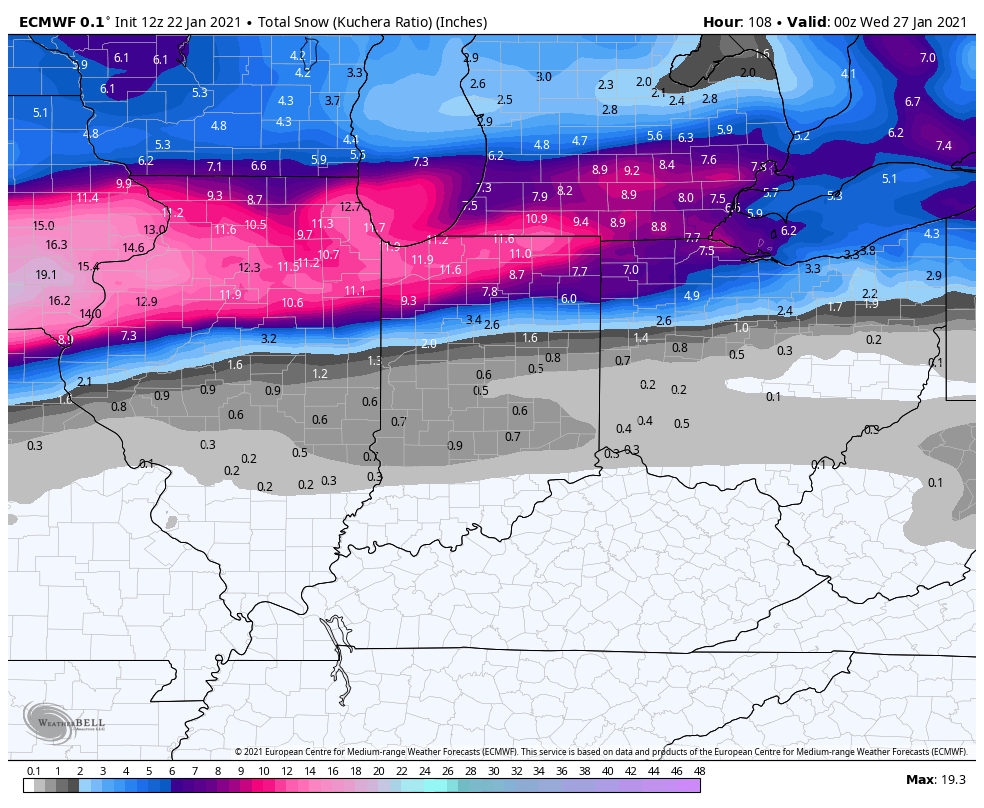 Here’s the latest Euro (as of Friday afternoon–please check for updates on our page as data will change) The Euro hasn’t changed much in the last 2 days and brings snow (heavy at times) into our northern counties (Lake, Porter, LaPorte) and snow that changes to a wintry mix then back to snow in our southern tier of counties (Newton, Jasper, Starke):