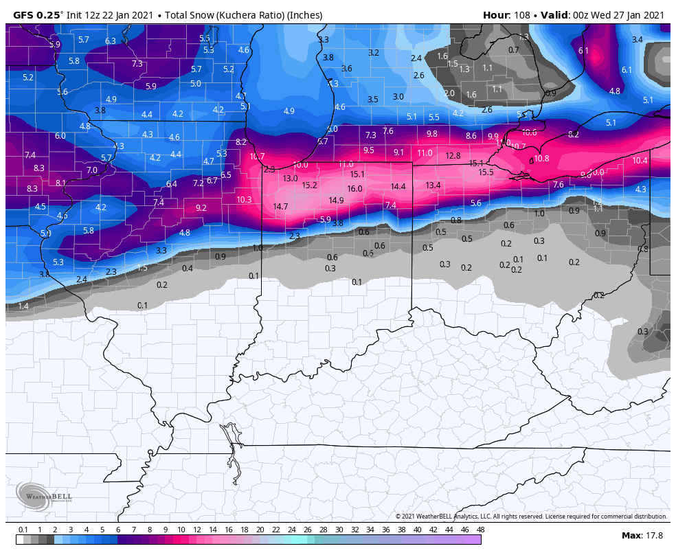 As of this Friday afternoon, the models AVERAGE 8-14 inches of snow across a good portion of the Region. Again this will change, but we have the potential for a good snow.