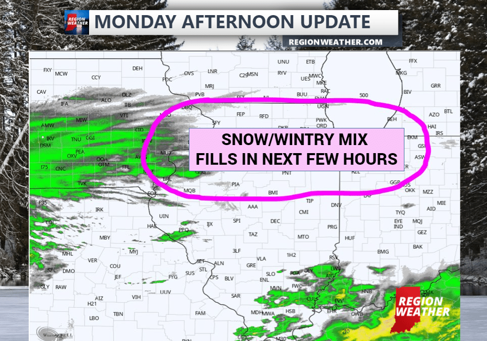 After a large cluster of storms well to our south cut off some of the moisture flow out of the Gulf (as expected), we’re expecting our late afternoon/evening snow and wintry mix to fill in on radar over the next few hours as the moisture transport resumes.