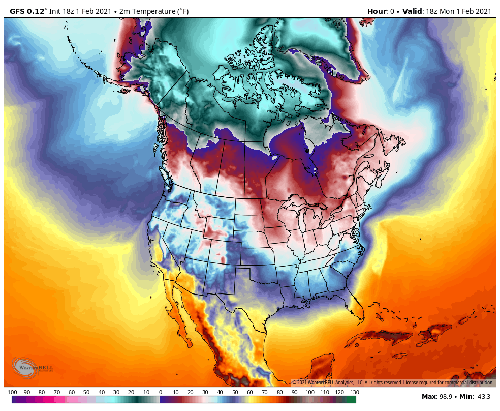 Air directly from the North Pole will dislodge into western Canada over the next few days and our mid-week storm system will move through the Region and head northeast into eastern Canada. As that storm goes up–that cold air in western Canada gets pulled down with a widespread cold-spell expected for the eastern US.