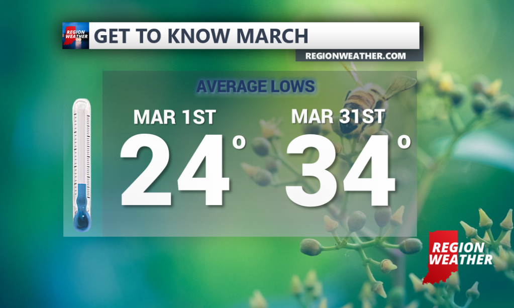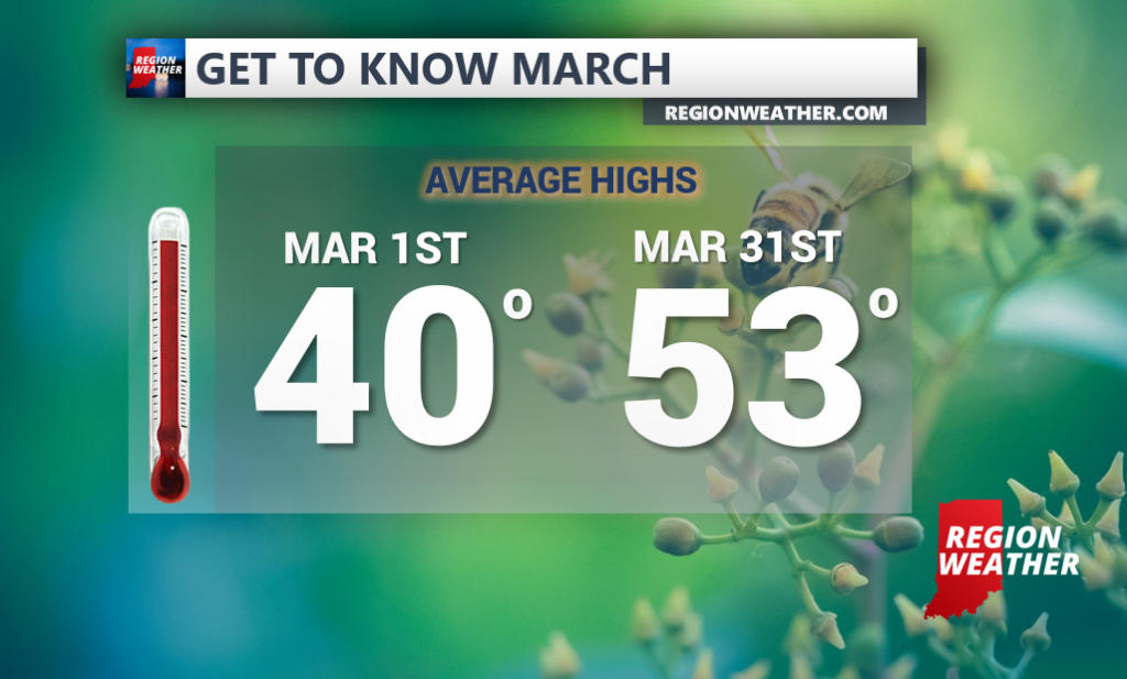 We’ll start with average high temps which will see a nice rise going from 40 degrees to start the month to the low to mid 50s to end the month. Remember, this is just the mid-point. We typically see our first 70 degree temps this month.