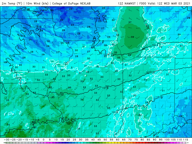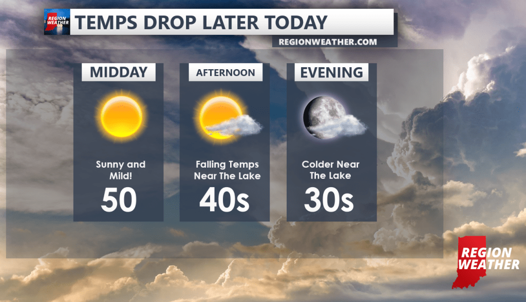 This afternoon our winds will shift out of the north bringing much colder air inland–most noticeably closest to the lake. Temps will go from near 50 down into the 30s by evening–a much colder afternoon and evening for Lake, Porter, and LaPorte counties!