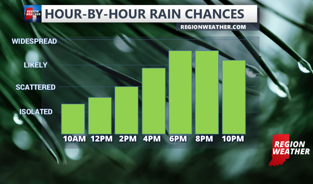 Rain will make a return today as an area of low pressure wraps up to our west helping push waves of showers and even a few rumbles to the Region today into tonight. Here are the rain chances hour-by-hour with the bulk of the rain moving in this afternoon into the overnight: