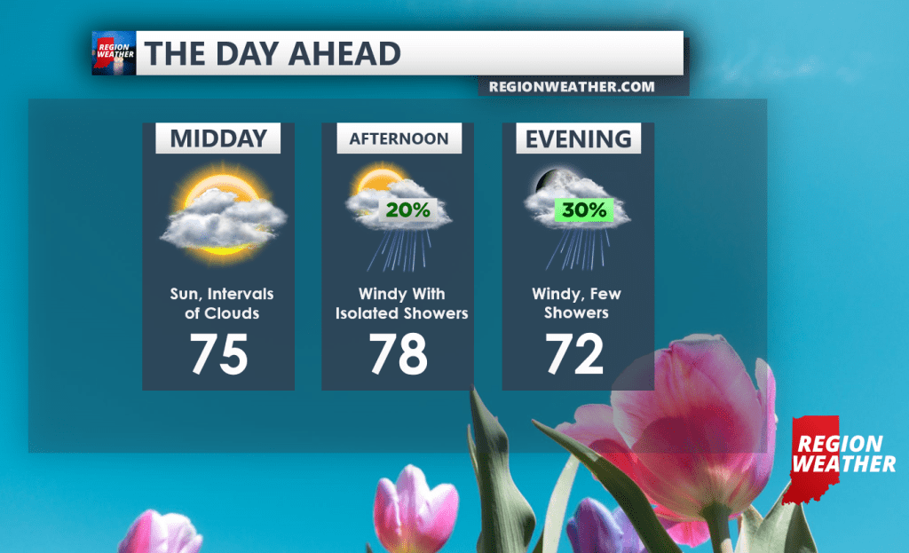 We’ll continue to reside on the warm side of this area of low pressure moving in from the west and we’ll begin to add some wind and shower chances as the low itself approaches. We’ll reach into the upper 70s to near 80 again today! Clouds will begin to increase with a few showers dotting the radar this afternoon into the evening.