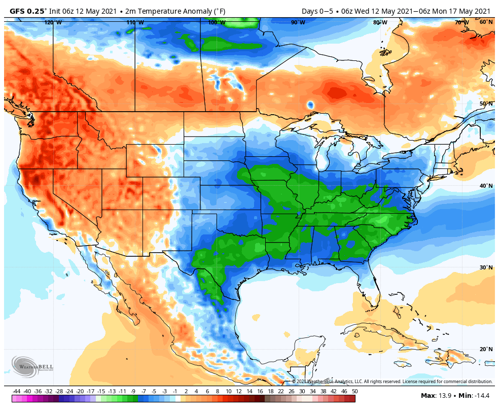 Take a look at temps vs average the next 10 days. The warmer colors are where high temps are above average: