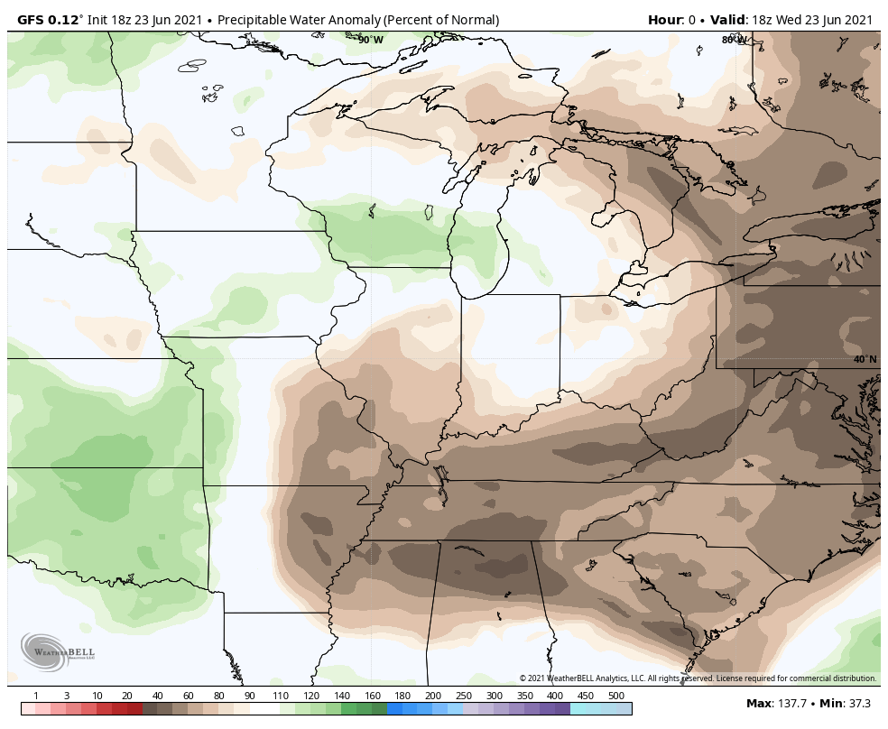 Below you’ll see the increase (and staying power) of the atmospheric moisture which goes from 40% of normal to over 200% of normal at times. As a result any storms will be capable of producing some very heavy rain and that threat will continue through at least early next week.