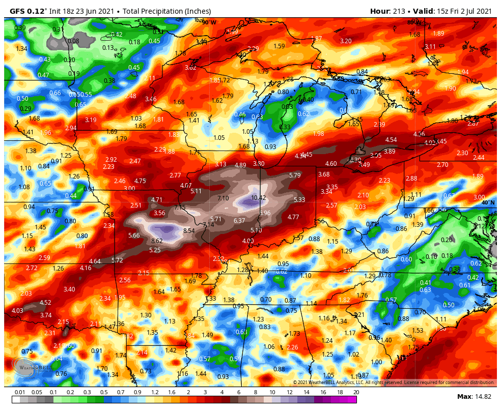 As a result, here are some of the rainfall amounts guidance is coming up with over the next 7-10 days–keep in mind rainfall from thunderstorms does not fall evenly. We also look at this for trends rather than exact amounts in exact locations: