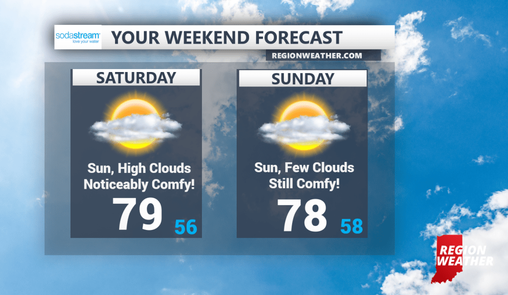 After a busy stretch of weather, high pressure and cooler, much drier air will settle into the Great Lakes and the Region over the weekend bringing lots of sunshine and pleasant temps in the upper 70s. We’ll see periods of high clouds passing through from a system to our south, but we’ll stay dry with comfortable humidity both Saturday and Sunday! Enjoy!