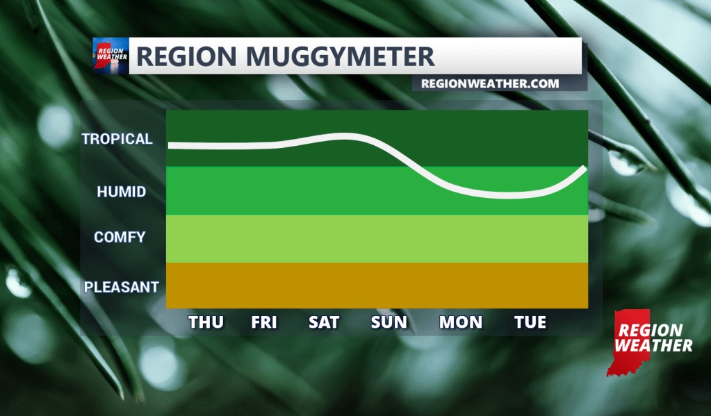 The humidity will lay on thick through the weekend as we remained locked into a tropical airmass. A cold front will sweep through the Great Lakes late this weekend into the beginning of next week–but with a hurricane likely to make landfall somewhere along the Gulf Coast–this will push that tropical airmass back north preventing any noticeably drier, more comfortable air from getting here until perhaps late next week.