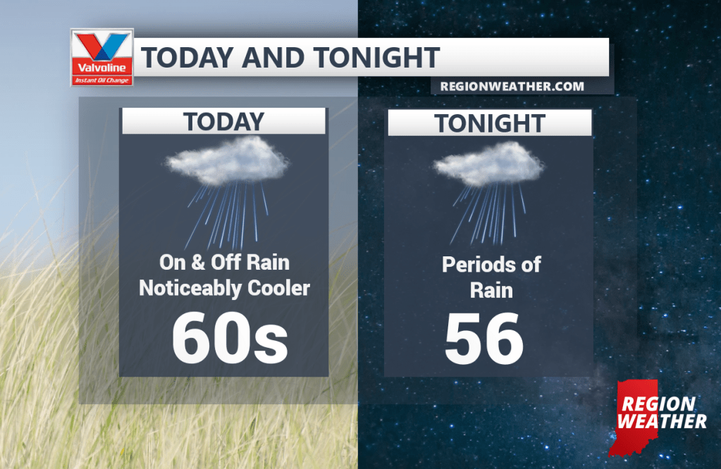 Let’s start with today–the cold front has moved through and temps will slowly tumble through the 60s the rest of the day. Rain will come and go as this system better organizes to our east. Winds will also pick up, especially lakeside where a Lakeshore Flood Advisory has been issued due to increasing wave heights today.