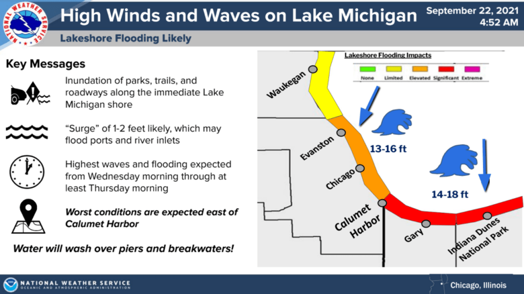 These winds will align perfectly with the length of the lake helping to push wave heights into the 10-18 foot range. Those that live in and around the lakeshore know the drill–lakeshore flooding and erosion is likely over the next 48 hours.
