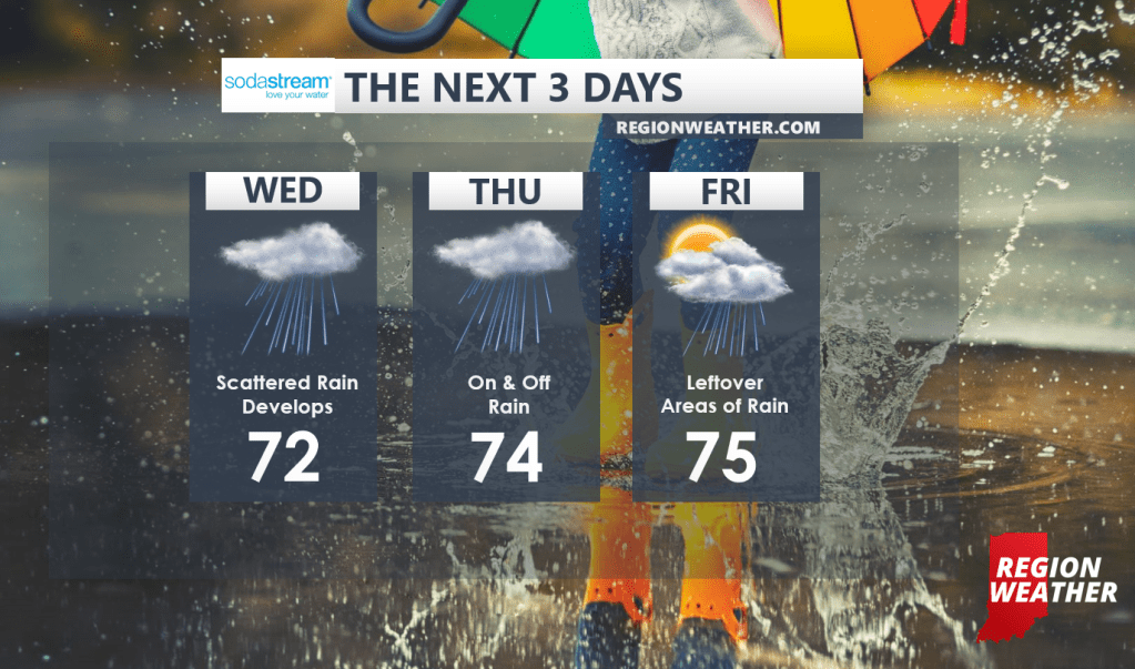 An area of low pressure will spiral its way towards the Region from the southeast bringing on and off rain over the next few days before the system finally exits. We could hear a few rumbles on Friday with a bit more energy in the atmosphere when the system departs. Overall, no days look like a washout–but plan for some periodic rain through Friday!