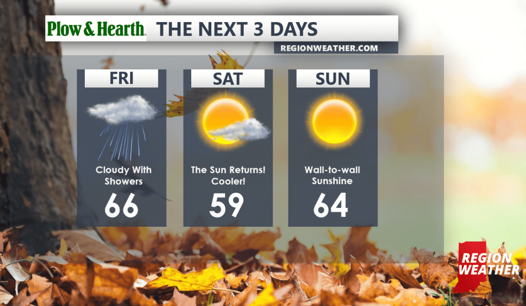 Get ready for a sun-filled weekend ahead, but first–today. A cold front will continue to push east through Indiana. As another wave of low pressure develops to our south, we’ll see a few last waves of rain move through today into tonight.
