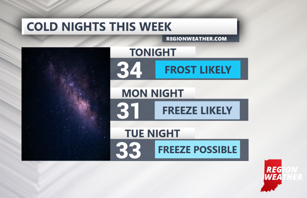 Colder air continues to move into the Region and will settle into much of the eastern half of the US this week. The combo of mainly clear skies and relatively light winds will allow our temps to tank at or below freezing for multiple nights this week. Here’s a look at the next few nights:
