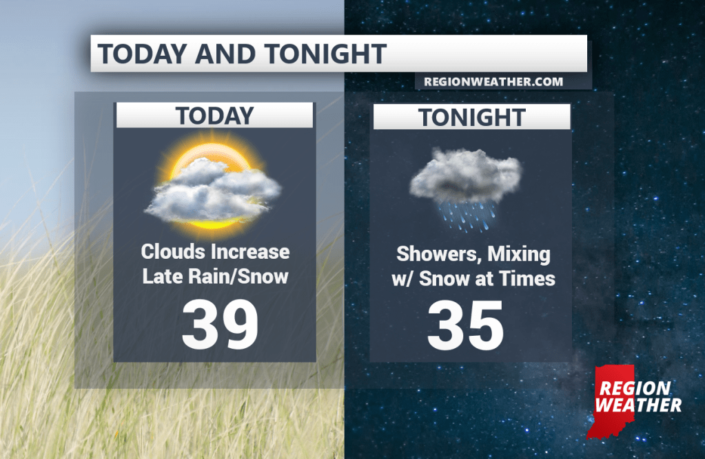 Happy Friday! Sunshine will give way to cloud cover today with some late day rain/snow mix moving in. We’ll settle into a showery overnight with temps remaining steady in the mid to upper 30s.