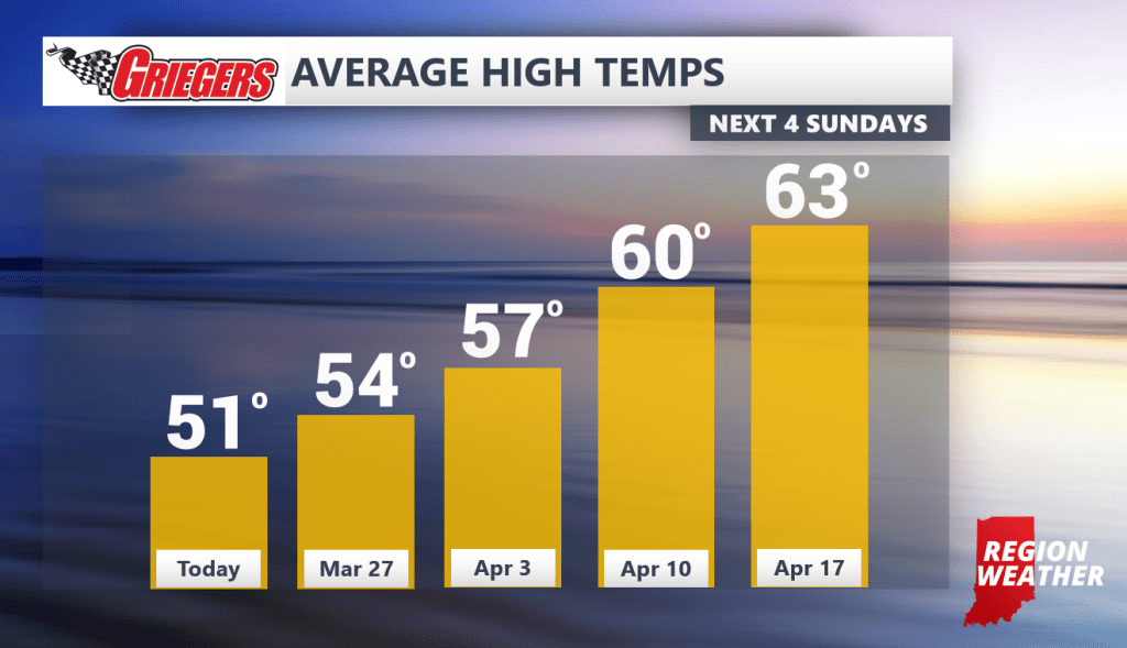 We see the fastest increase in our average highs this time of year as that sun angle continues to get higher in the sky and the sun provides exponentially more energy locally than it did in the winter. We’re gaining 3 degrees per week on our averages and soon 60-70 degree days will be common! Join us for our Region Weather LIVE broadcast later this evening to talk warmer days and even some thunderstorms this week!