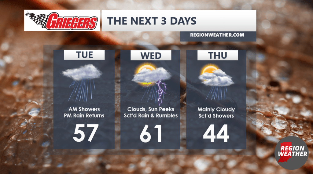 Our morning round of showers will quickly fade leading to several dry hours today before another round of rain is anticipated later today. Highs today will peak in the upper 50s with 60s expected Wednesday with a thin sliver of warmer air that gets wrapped into this system. Still thinking we could hear a few rumbles Wednesday before the front passes bringing us a much colder end to the week with scattered showers.