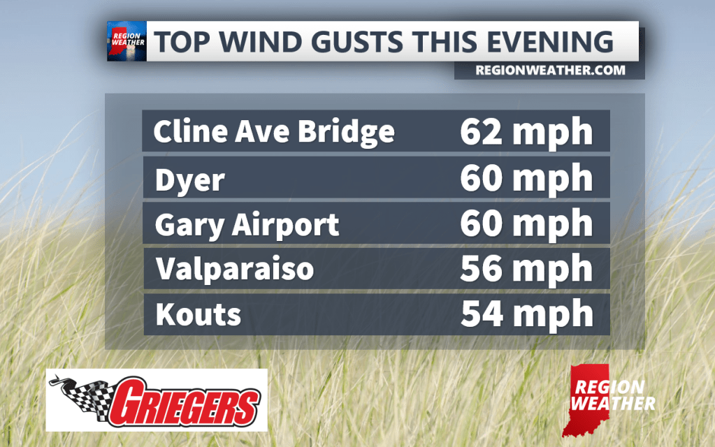 Strong winds accompanied brief downpours of rain and graupel this evening as documented by the video taken by Mari out of Gary.