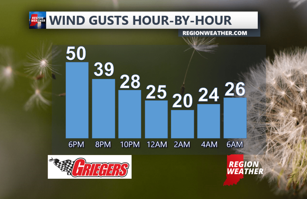 Our windy day will transition into a windy evening and then into a breezy overnight. All adjectives aside, we’ve had some powerful gusts today! NIPSCO is reporting over 7,000 customers without power as of early this evening. The good news is that winds will back off a bit overnight but we’ll remain breezy through the day tomorrow. Here is your hour-by-hour wind gust forecast: