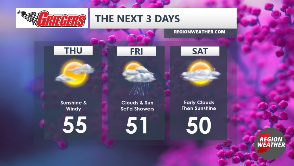 Brr! What a change this morning temperature-wise! We’ll recover into the 50s today with lots of sunshine. Winds will become quite gusty today with gusts over 45mph possible in spots. We introduce scattered showers as a weak system slides through Thursday night through Friday into Friday night.