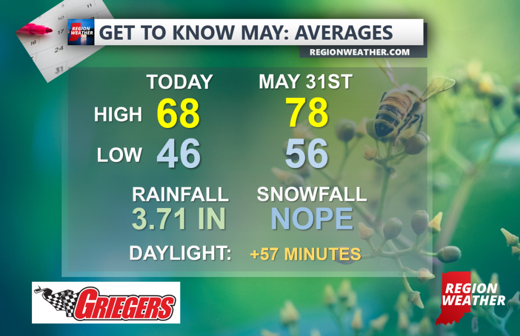 As we always do at the beginning of the month, let’s get to know where we are now and where we’re headed climatologically! By the end of the month our average highs approach 80 as we continue the warming process into the summer months. We also continue to gain daylight with sunsets around 8:15pm by Memorial Day and sunrises in the 5:15am range. All together we gain close to another hour of daylight by the end of May!