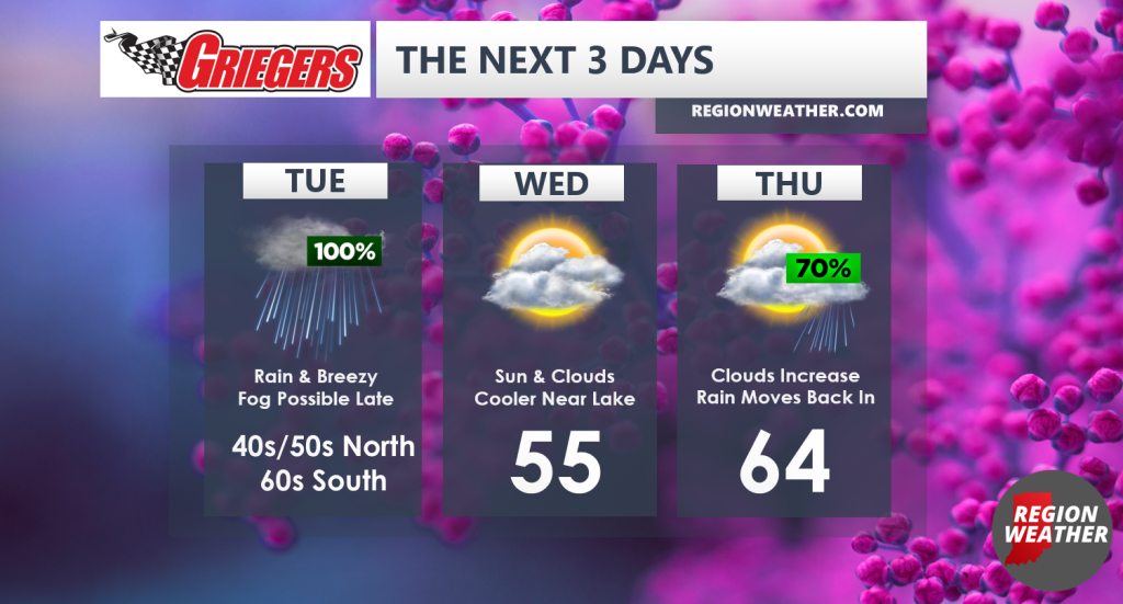 Our soggy morning commute is here as we reside on the northern side of a storm system bringing rain and storms to much of the Ohio Valley. Temps will range widely today with highs struggling to get out of the 40s next to the lake. Meanwhile the transition to 50s and 60s will take place as you head south with 70s possible later today in southern Newton and Jasper counties as this low tracks right through the Region. We’ll all turn cool tomorrow with another round of rain arriving Thursday!