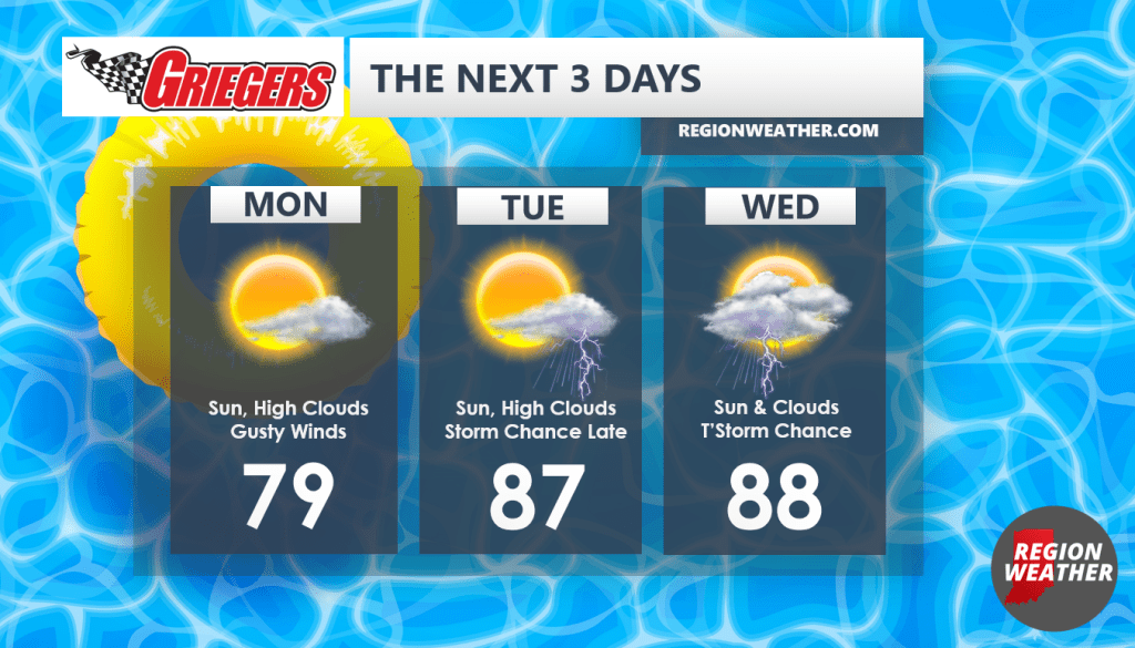 Put some air in the floaties because we’re about to switch to the middle of summer around the Region. As we discussed in last night’s Region Weather LIVE, the humidity will build today and we’ll be downright humid Tuesday and Wednesday. We look breezy and dry outside of a potential storm complex late Tuesday into Wednesday that may develop and move through. We’ll keep tabs on that for you, otherwise stay hydrated because the heat arrives Tuesday!