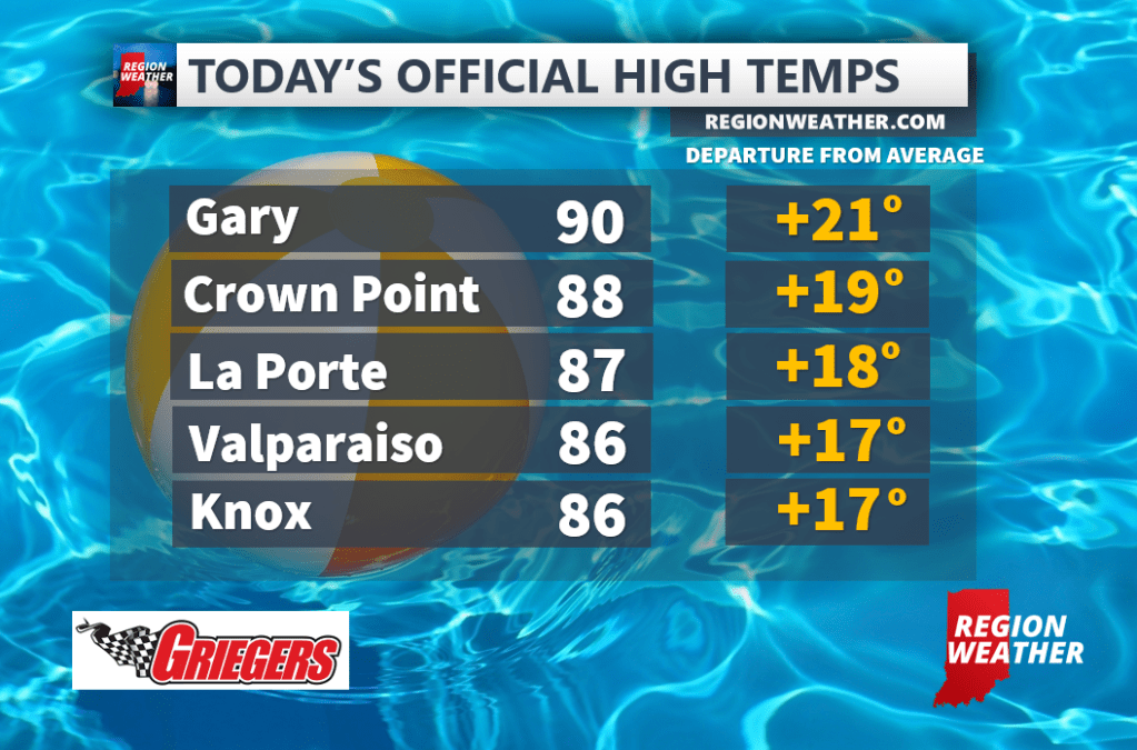 It was our warmest day of the year so far! Official highs featured Gary topping the list at 90 degrees! Mid to upper 80s elsewhere, but combined with the humidity today we felt more like 90-95 degrees across the entire Region. More heat and humidity is on the way tomorrow.