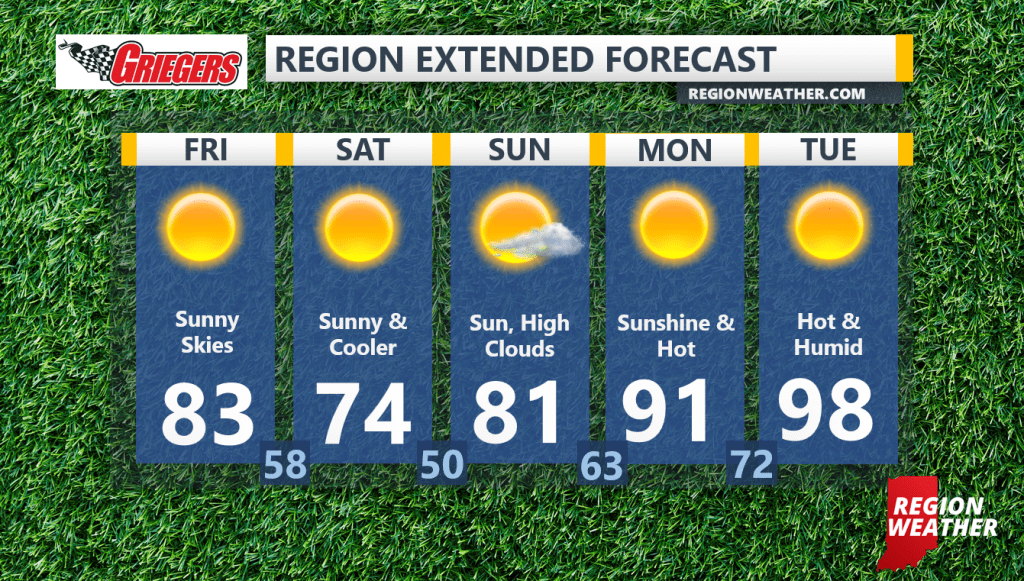 Special thanks to Grieger’s Motor Sales for sponsoring our new 5 day forecasts. While we appreciate your support, you won’t need much of it this weekend as we’re expecting absolutely picture perfect weather for all our Region Dads! We turn on the heat again next week with limited storm chances (20% on Sunday, that’s it) through early next week! Enjoy the weekend everyone!