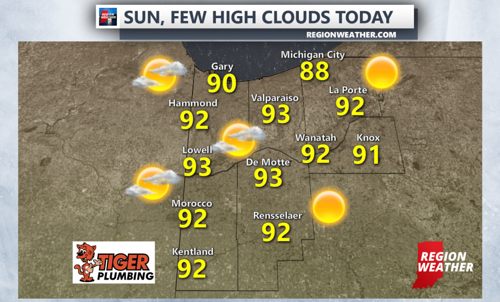 Happy Friday everyone! The heat continues to build in from the west with temps expected to exceed 90 today across the majority of the Region. It will be a touch cooler near the immediate lakeshore–a good day for the beach! High clouds will pass overhead from time-to-time off of storms in Iowa that will stay well west of us. We’ll talk much-needed weekend rain chances in our next post!