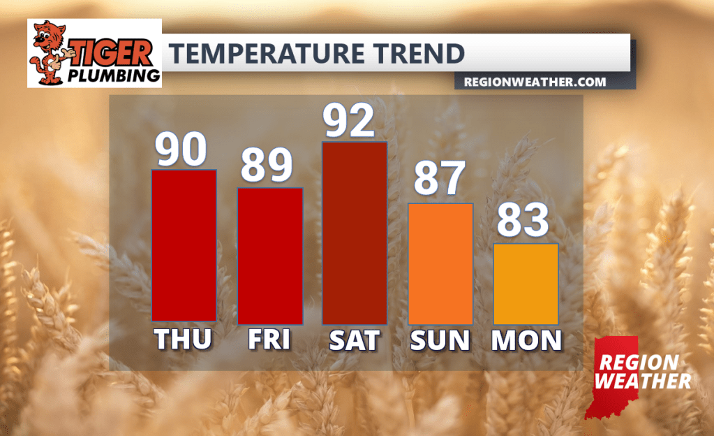 Our humid, summery feeling isn’t going away anytime soon as we’ll be in or around the 90s the next few days. Shower and storm chances will be periodic, but common with our first potential this afternoon into the evening with a brief system sliding through the Region. Better chances for a more organized complex of storms to move through exist late Friday into Friday night and then again late Saturday into Saturday night as it looks right now. Both of these opportunities for rain carry a severe weather potential with them–we’ll be on it. Meanwhile, here are our projected high temps the next 5 days: