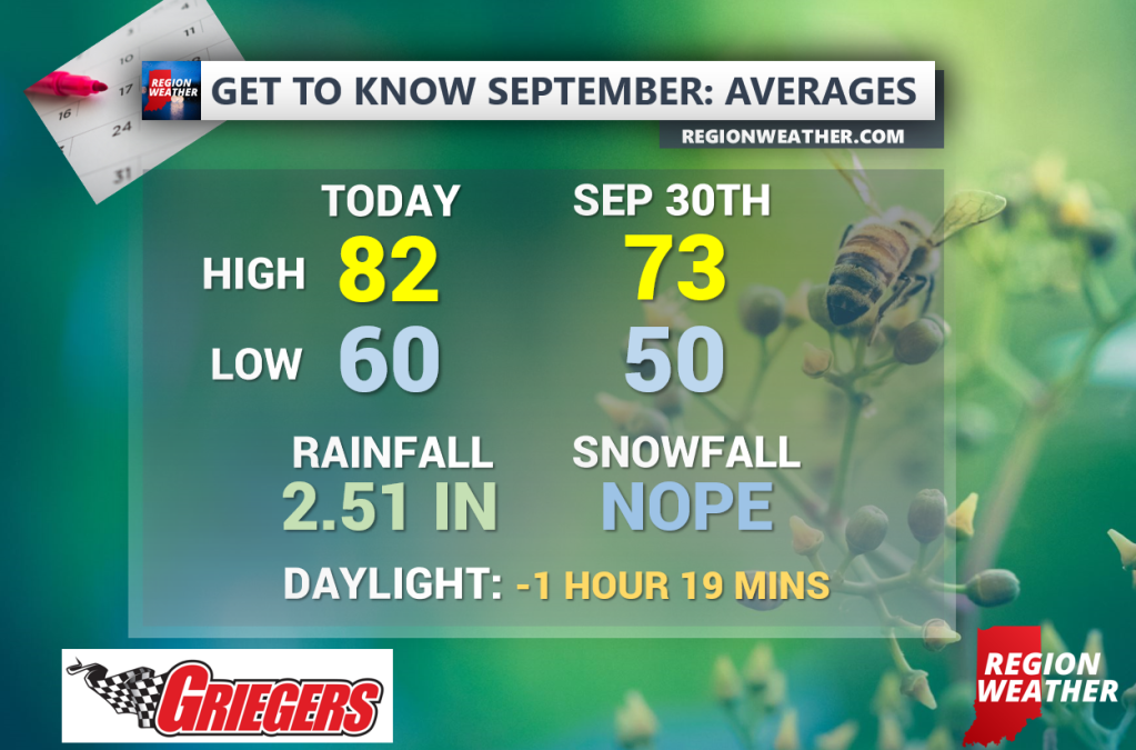 Happy Meteorological Fall everyone! It certainly won’t feel like it today with highs pushing the upper 80s across the Region. Here’s a look at the averages for the month of September–this is a month of change and we’ll notice it with cooler days and nights by the end of the month with average highs in the low 70s and lows near 50. We lose daylight this month faster than any other month and on the rain side, it’s a forgettable 7th place for rainiest month.