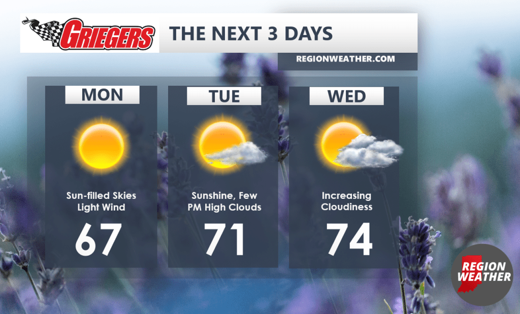Happy Monday! Sun-filled skies can be expected today as high pressure continues to settle in over the Region. After a chilly start, we’ll warm nicely into the mid and upper 60s today, coolest near the lake. Expect sunshine with high clouds Tuesday with highs reaching into the 70s. Miss the cooler fall-time air? You won’t have to wait long. Our next storm system will arrive later Thursday with a reinforcing shot of cool air to end the week into the weekend.