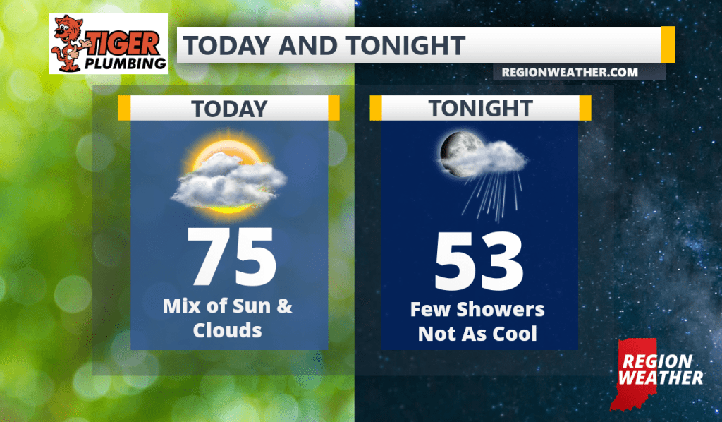 Good Wednesday morning everyone! That sharp fall-time front is on the way, but we’ll squeak out another day and a half of warmer temps with highs in the 70s today and tomorrow. Clouds will float in and out today with a chance of a late day shower as a weak system slides through NW Indiana. Enjoy the day everyone!